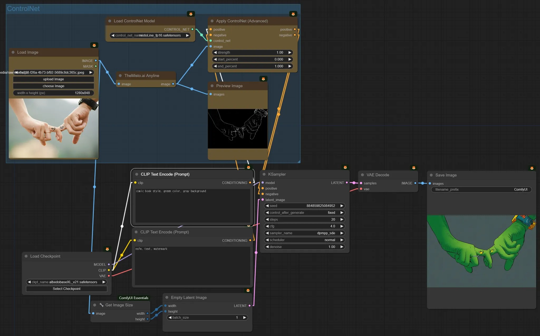 In the basic workflow of 4.2.1. ControlNet (SDXL), this workflow applies the MistoLine model and preprocessor, which follows lines well and draws accordingly. The application method can vary slightly depending on the type of ControlNet. Using ControlNet, you can create various images while maintaining the structure of the hands.