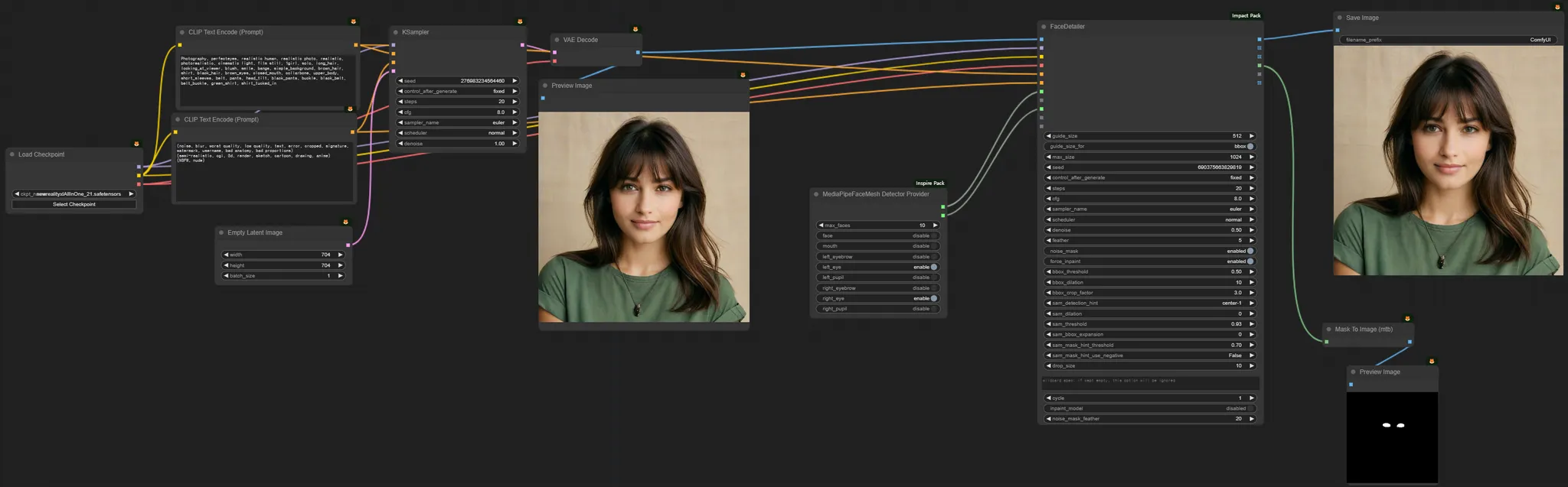The workflow involves generating an image and then using the MediaPipeFaceMesh Detector Provider node to detect the eye region. Following this, use the FaceDetailer node to regenerate only the eye area. Additionally, you can use other options in the MediaPipeFaceMesh Detector Provider node (such as face, mouth, eyebrows, eyes, and pupils) to detect and regenerate other facial parts besides the eyes.