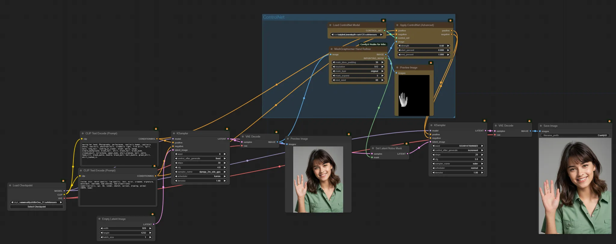 이미지를 생성한 다음, MeshGraphomer Hand Refiner 노드를 통해 올바른 손 모양으로 보정해주고, 컨트롤넷 depth를 통해 손 부분만 다시 생성하도록 하는 워크플로우 입니다.