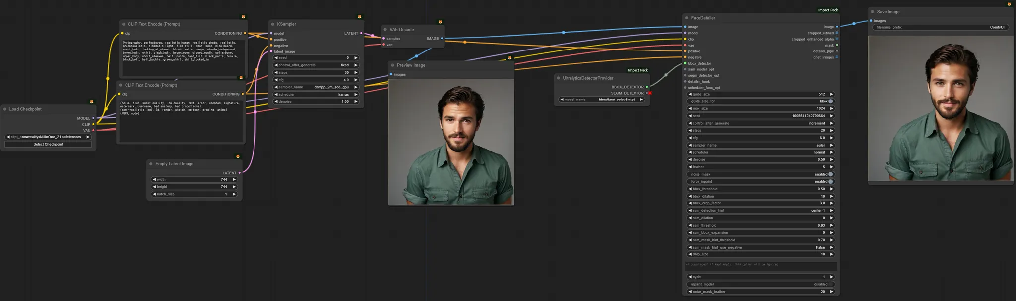 이미지를 생성한 다음, FaceDetailer 노드를 통해 얼굴 부분을 검출하고, 얼굴 부분만 다시 생성하도록 하는 워크플로우 입니다.