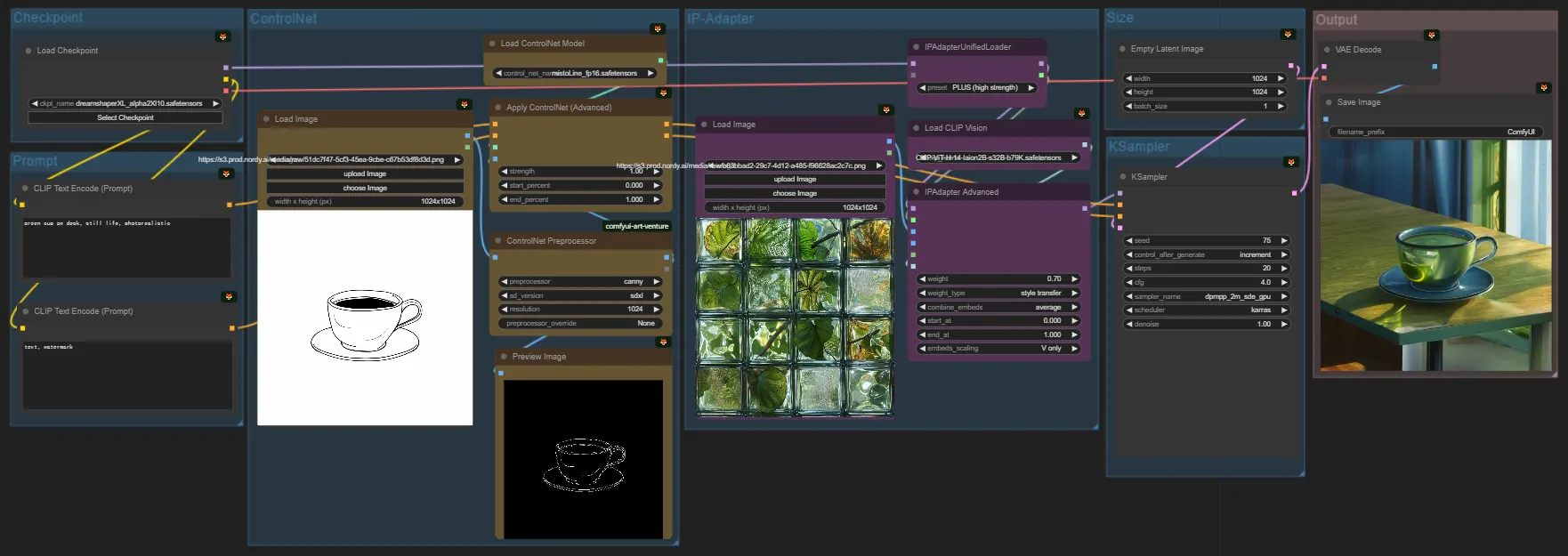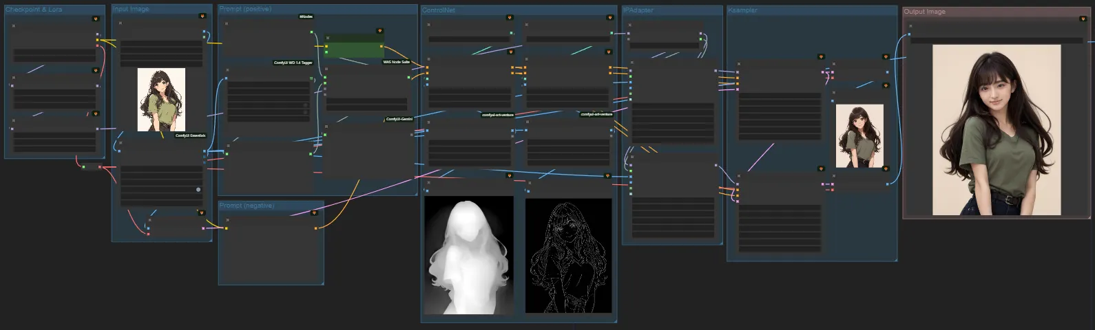 The elements you’ve learned about, such as ControlNet and IP-Adapter, can be used together as follows. While we've previously covered how to use each independently, let's now explore how to utilize them together.