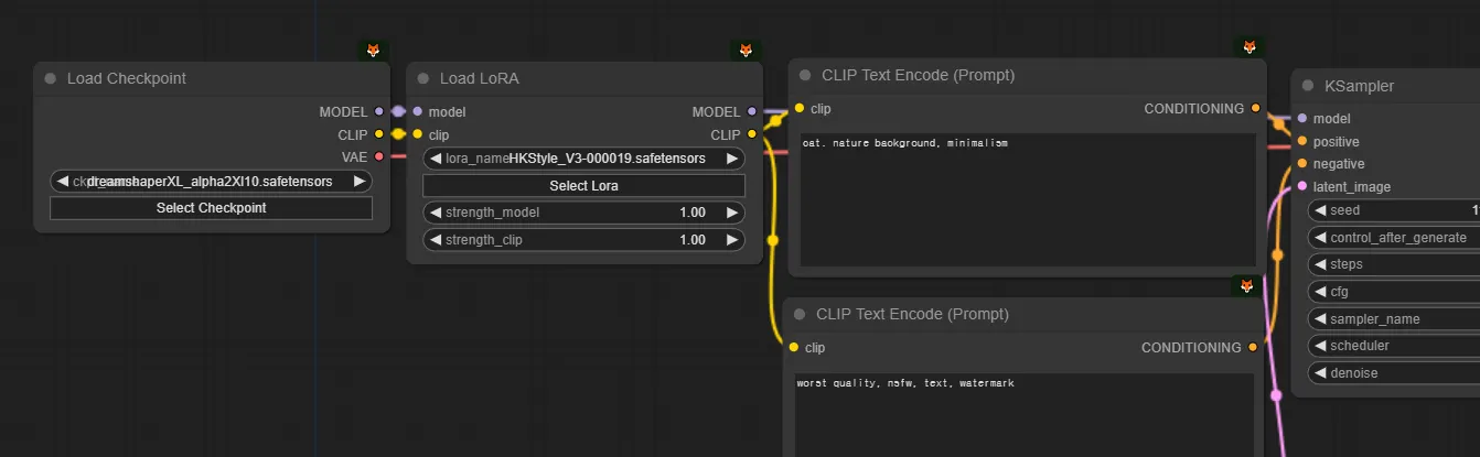 위 그림은 체크포인트와 로라를 연결한 모습인데 model, lora_name, strength_model을 주목해주세요. 이 값들이 아래와 같다고 합시다.