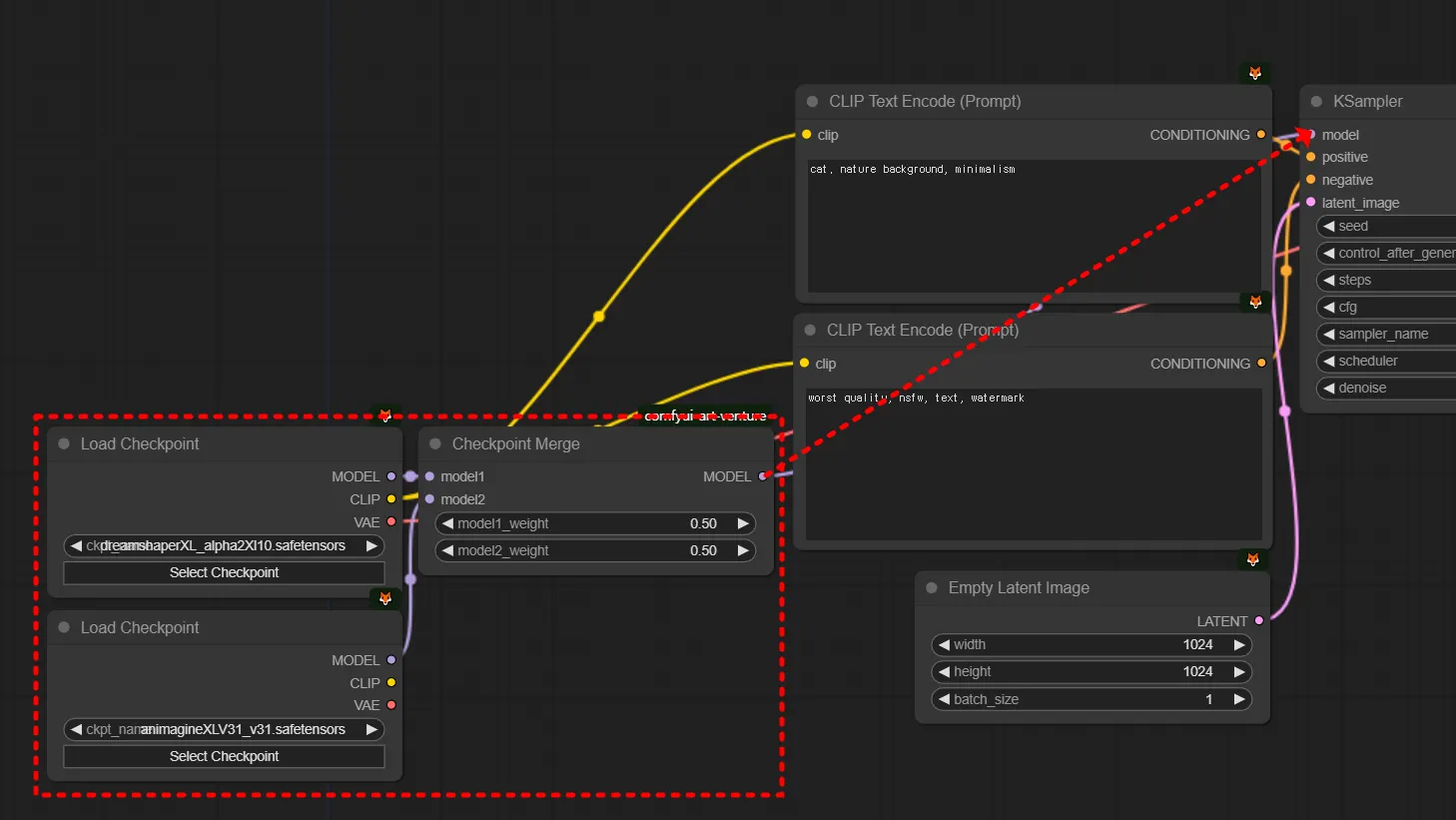 그냥 이렇게 하니깐 되네? 오 진짜 스타일도 합쳐지네? 해서 쓰고있는 겁니다. (이해를 위해 알려드리는 것이고 Checkpoint Merge가 아주 유용하다는 것은 아닙니다. 또한 연결시 붙어있는 Clip과 Vae는 그것을 알고 제대로 사용하고자 하는 것이 아니라면 어느 것을 쓰셔도 무방합니다.)