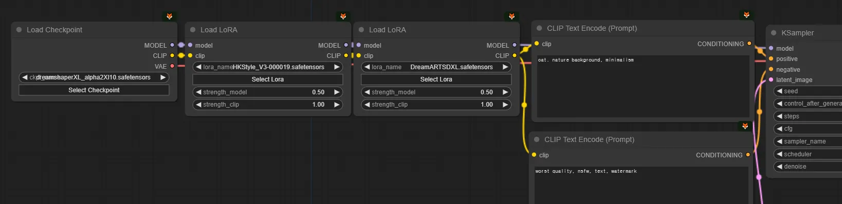 MODEL = 체크포인트 + 0.5*로라1 + 0.5*로라2 # 로라1, 로라2 앞에 0.5는 위 그림에 있는 Load LoRA에 있는 strength_model 값입니다
